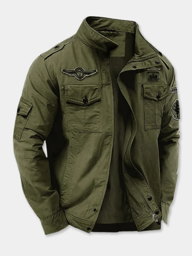Constructed from 100% cotton with aviation-inspired patch detailing and multiple utility pockets, this field jacket carries the spirit of vintage flight jackets without the costume. Built for men who appreciate functional design with character.