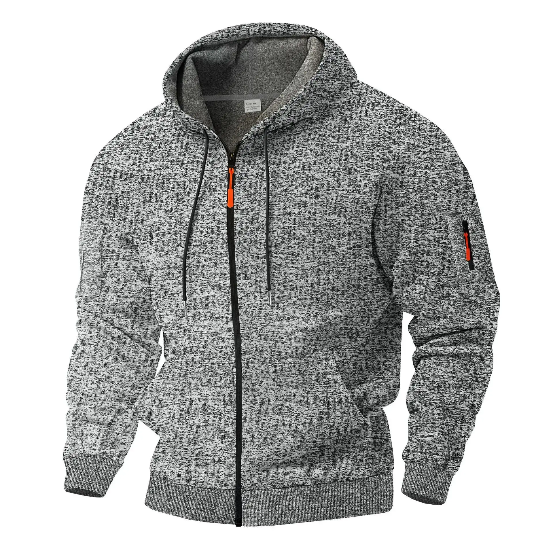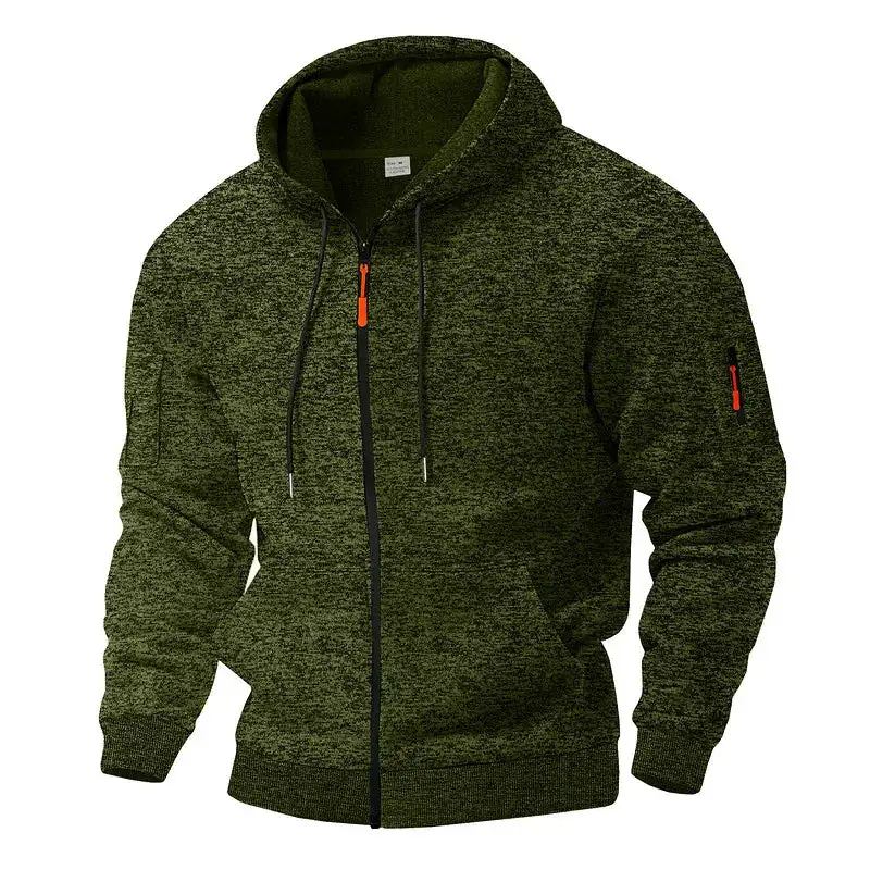 This hoodie is constructed from a heathered fleece-blend fabric that balances warmth with breathability. The full-length zipper features contrast detailing that adds a refined accent to the athletic silhouette, while the adjustable drawstring hood provides customizable coverage. A zippered sleeve pocket offers secure storage for essentials, complementing the dual hand pockets at the waist. Ribbed cuffs and hem create a tailored finish that locks in warmth without restricting movement.